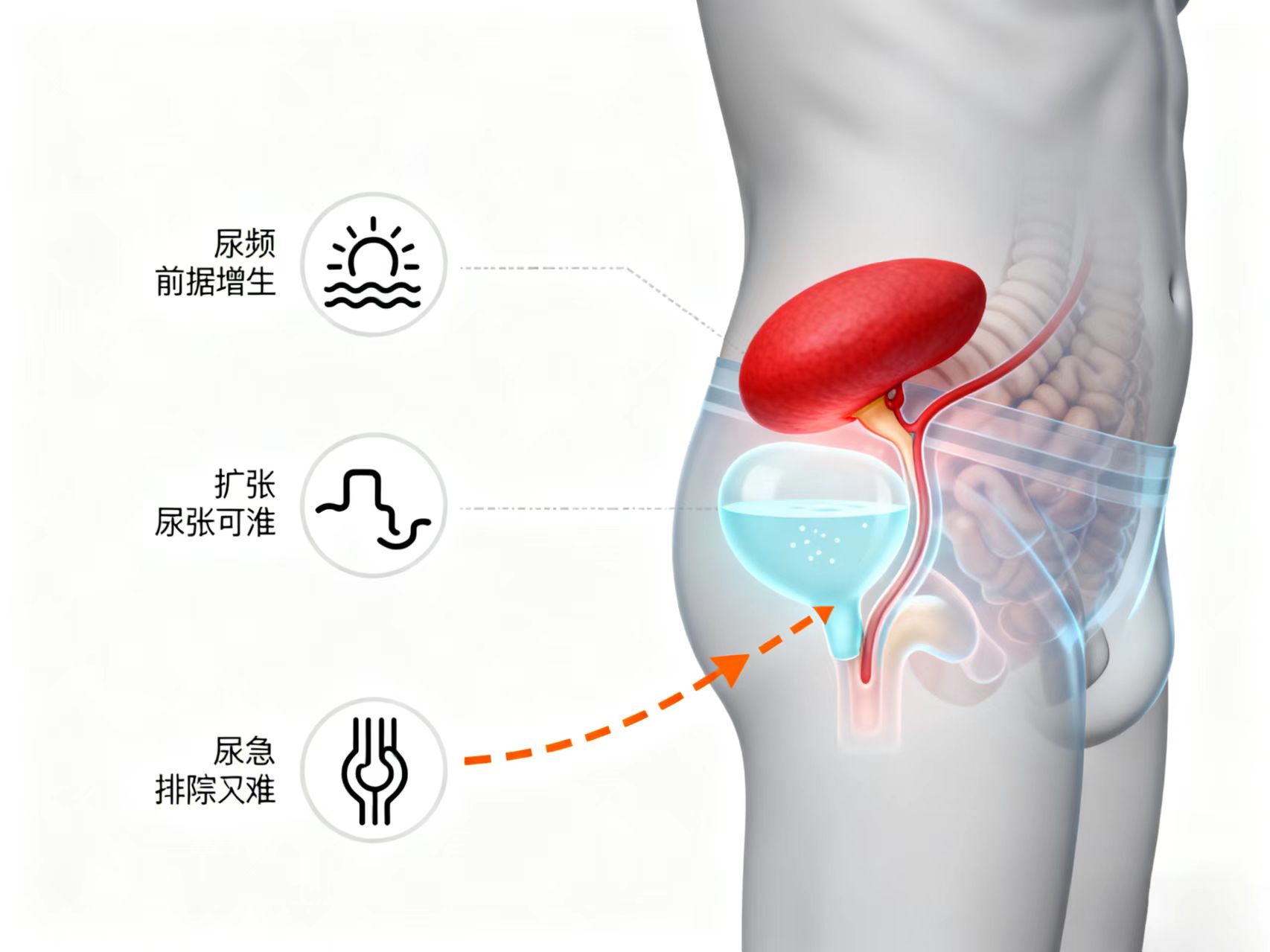 · 关键点: 尿道正好从前列腺中间穿过。当前列腺增生时,就会像“攥紧的拳头”一样,从四面八方挤压这条“水管”(尿道),导致排尿困难等一系列症状。